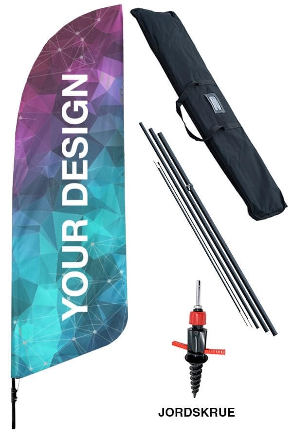 Når du køber beachflag fra LetUsPrint.dk, har vi gjort det nemt for dig, at få et komplet sæt leveret til døren med dit helt eget design. Et komplet sæt indeholder: Flag, stang (samles af flere dele), valgfri base/fod samt transporttaske. Vælg blandt de forskellige varianter og sammensæt dit strandflag, så det matcher dit behov.