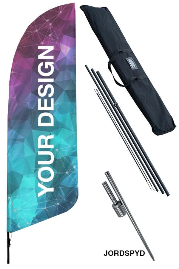 Når du køber beachflag fra LetUsPrint.dk, har vi gjort det nemt for dig, at få et komplet sæt leveret til døren med dit helt eget design. Et komplet sæt indeholder: Flag, stang (samles af flere dele), valgfri base/fod samt transporttaske. Vælg blandt de forskellige varianter og sammensæt dit strandflag, så det matcher dit behov.