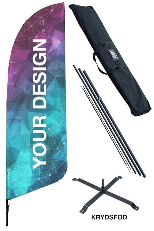 Når du køber beachflag fra LetUsPrint.dk, har vi gjort det nemt for dig, at få et komplet sæt leveret til døren med dit helt eget design. Et komplet sæt indeholder: Flag, stang (samles af flere dele), valgfri base/fod samt transporttaske. Vælg blandt de forskellige varianter og sammensæt dit strandflag, så det matcher dit behov.