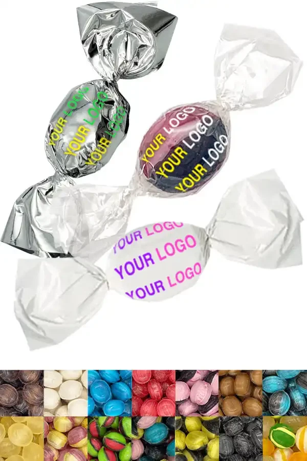Gør dit brand synligt med bolsjer med logo – den perfekte giveaway til messer, receptioner og events. Disse klassiske twistede logobolsjer leveres i komposterbar folie med fuldt tryk af dit design. Du vælger selv om folien skal være klar, hvid eller sølv, og vi trykker hele folien – så farver, logo og budskab får maksimal synlighed.