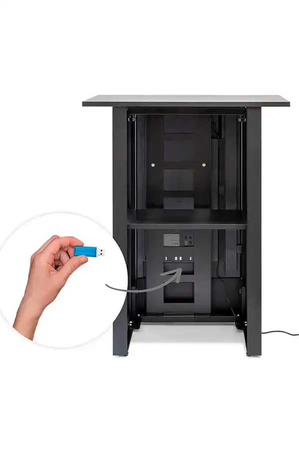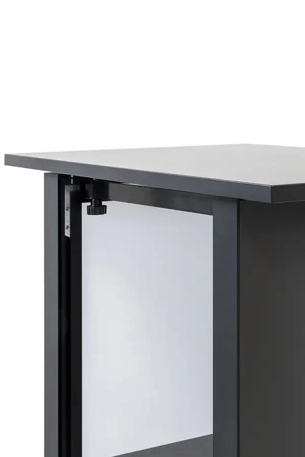 Inde i disken finder du en praktisk opbevaringshylde, så materialer og personlige ejendele kan gemmes væk. Det giver et ryddeligt udtryk og sikrer, at al opmærksomhed samler sig om din visuelle præsentation.