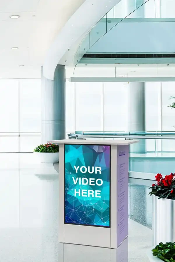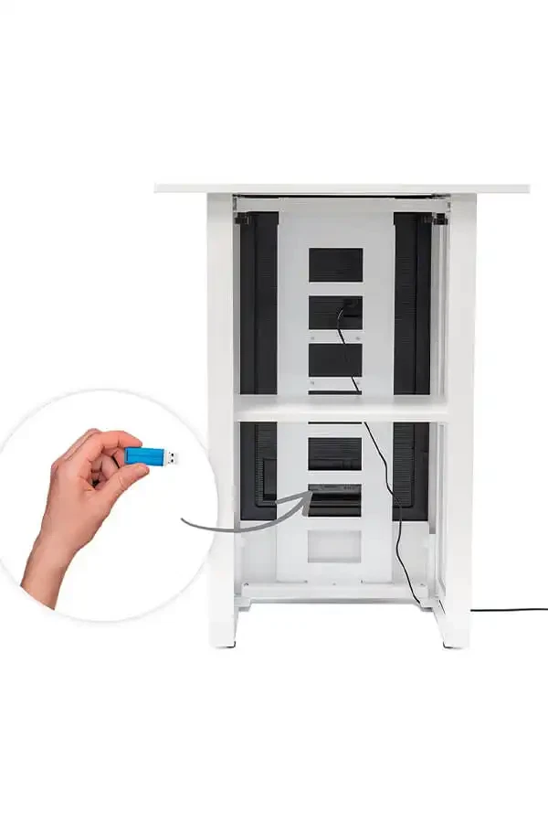 Digital Counter leveres med en lodret 32” Samsung-skærm og en bordplade, der elegant rager ud på alle sider. Med en ideel højde på 93 cm er disken perfekt til både betjening og interaktion med kunder og besøgende. Vælg det design, der passer bedst til dit brand: moderne sort eller stilren hvid.