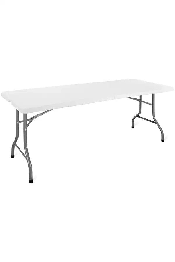 Sammenklappeligt bord til brug på messe, event, fest, markeder, eller til kongres. Bordpladen er udført i meget holdbart polyethylen. Bordpladen måler 180 x 75 cm. Foldebordet kan nemt klappes sammen, hvilket gør transport nemmere og sparer plads under opbevaring. En ekstra lås beskytter mod utilsigtet sammenklapning, og benene er forsynet med plastdupper for at beskytte gulvet mod ridser og forhindre bordet i at glide. Rammen er udført i pulverlakeret stål med diameter 25 mm. Med vores standard overtræksduge i hvid eller sort opnår du et mere elegant udtryk og med vores printede overtræksduge kan du skabe dit eget udtryk og opnå maksimal markedsføring / promotion af dit brand / budskab.