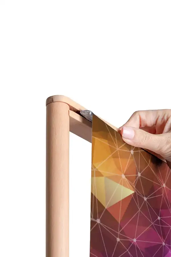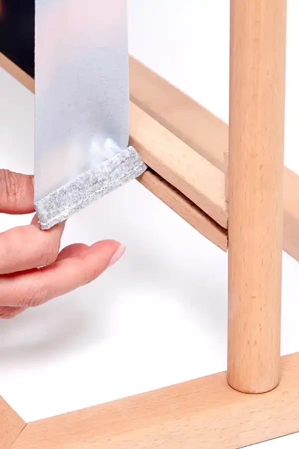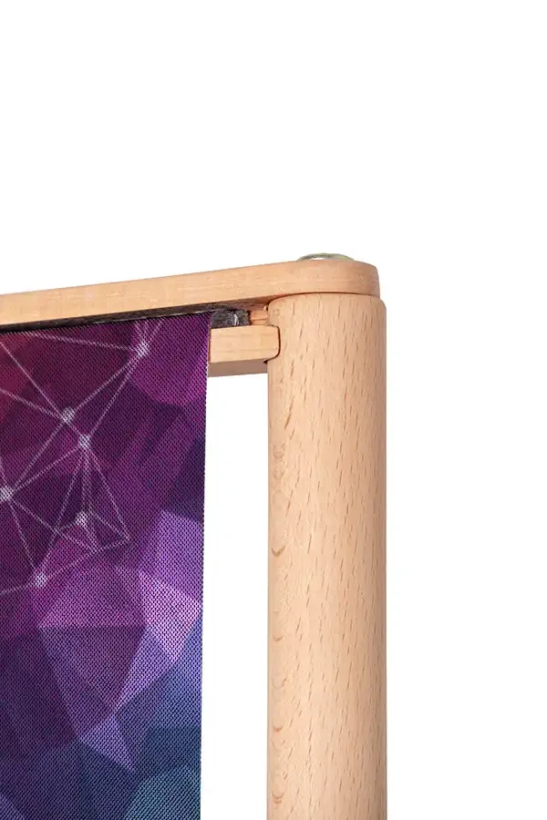 Den højkvalitets stofgrafik giver levende, farvemættede print og skaber blikfang ved enhver præsentation. Med 100 % genanvendt PES-keder på de korte sider kan du hurtigt udskifte din grafik efter behov. Fastgør blot grafikken i bunden med de medfølgende kiler, og du er klar. Uanset om du bruger Wood Display til udstillinger, events, kampagner eller hospitality-miljøer, får du en elegant og bæredygtig løsning.